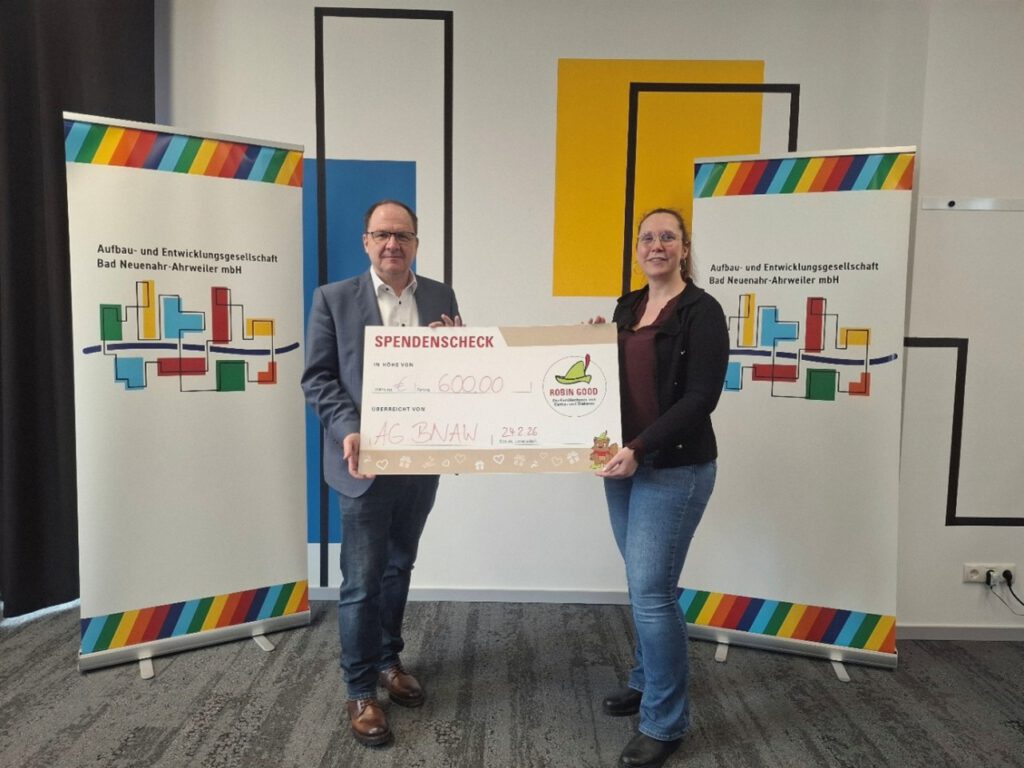 Mit einer Spende in Höhe von 600 Euro unterstützt die Aufbau- und Entwicklungsgesellschaft Bad Neuenahr-Ahrweiler mbH den Familienfonds ROBIN GOOD von Diakonie und Caritas. Herbert