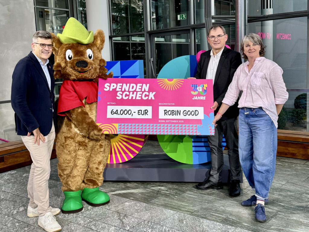 64.000 Euro für benachteiligte Kinder und Familien in Bonn – Maskottchen Robbie nimmt Scheck der Deutschen Telekom entgegen